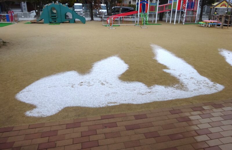 登園してきた男児、みどり組の部屋の前に残っている雪を見て「先生、クジラのガイくんおったで!」と、報告してくれる。雪の形が、発表会に向けて取り組んでいる「ながいながいペンギンの話」に出てくる、クジラのガイくんに見えたようである。「ここがしっぽで、ここが口で・・・」、確かに大きな体に、くるんと上に曲がったしっぽ、ひれ、パカっと開いた口。物語の中でオキアミの波を見つけて、口を開けて泳いでいるガイくんのようだ。