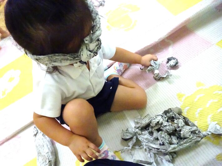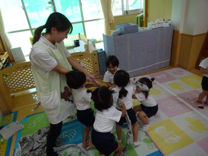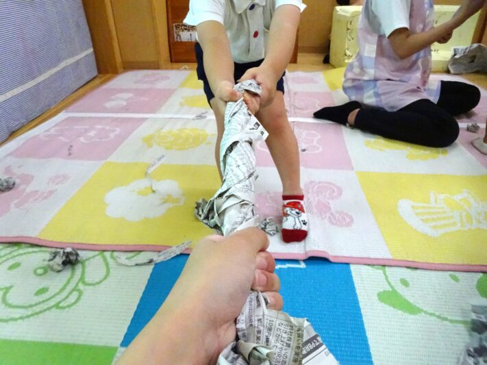 はじめは、新聞紙をちぎって丸めて投げたり、長くしてヘビさんにして遊んでいましたが、保育者が、新聞紙を長くしてねじっていたら、ある子がやってきて端っこをもって「うんとこしょ!どっこいしょ!」と遊びはじめました。しばらくすると、他の子ども達も集まってきて声を合わせて「うんとこしょ!どっこいしょ!」と声を合わせ始めました。「おおきなかぶのようや!」絵本の世界が思い出して楽しんでいます。今度は、新聞紙を鉢巻きにして「いらっしゃいませー!」とお店屋さごっこが始まりました。「何屋さんですか?」「たこ焼き屋さんです!」と答えて新聞紙をちぎって丸くまるめてたこ焼きを作ってくれました。「お皿はありますか?」「ちょっと待ってください。」新聞紙を切って端を折ったり丸めたりしてお皿を作り、その上にたこ焼きをたくさん乗せてくれました。お祭りに行った時の鉢巻きを締めた威勢のいいおじさんのイメージが残っていたのでしょうか。楽しい遊びになりました。今日の新聞紙の遊びは、今迄の経験をもとに友達同士情報交換しながら、新聞紙を色々なものに見立てたり、声を合わせて遊ぶ楽しさを再現したり、イメージを膨らませたり楽しい姿が見られました。