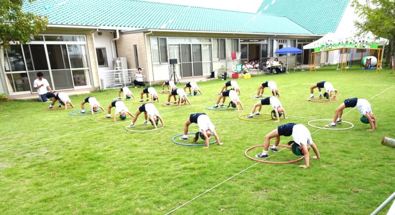 「〝運動遊びフェスタ”だから、運動遊びならお家の人とするものでも、じぶんたちでするものでも、何でもいいよ。」と伝え、意見を出し合う。〝自分たちの頑張っている姿を見てほしいもの″と、〝お父さんお母さんとしたいもの″で意見が出てきました。自分たちの頑張っているものとして、①合奏がしたい。曲は「てのひらをたいように」で、それぞれが挑戦してみたい楽器を選び挑戦する。②リレー、9人と8人の2チームになるので8人チームは誰かが2回走る。男女の人数は自分たちで決める。③体操教室で挑戦している「フラフープを見てもらいたい!」と言う意見が一番強かった。そこで、「フープ&バランス体操」が決まった。何のためにするのかを尋ねると、自分の体をしっかり止めたり、動かしたりできる体の強さ、体がぐらぐらしそうになっても辛抱したり、気になることがあっても集中する心の強さを身に着けたい。・・親子でする競技は、①親子でリズム体操、②子どもⅤS大人玉入れ競争、③子どもⅤS大人玉転がしドッジボール、④大玉転がし。小、中、大の玉がテーマになりました。最後に閉会式で金メダルが欲しい。以上に決まりました。10月2日、思いっきり頑張た、そして、楽しい運動遊びフェスタができました。