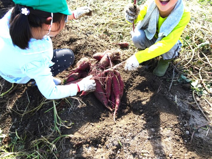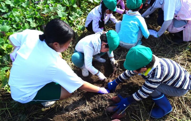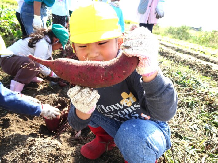 出発する前に「じゃがいも堀をさせてもらった藤本さんの畑だよ。」と伝えると、「さつまいももいろんな種類があるんかな?」と、じゃがいもに色々な種類があったことを思い出す。畑に着いて早速茎を引っ張ってみると「すぽーん」とたくさん繋がったさつまいもが一度に抜けた。となりの列へ行くと、丸くてでこぼこしたお芋が多く、引っ張ってもなかなか抜けません。「お芋と綱引きや!」「象くらい強いなー!」と、一生懸命。「こっちもある。大家族や!」と、たくさんのお芋に驚きながら楽しんでいました。園に戻ってきて「芋の種類が違うのもあったみたい。」と話す子ども達。「最初の方は赤紫。後の方は茶色っぽかったで。」、色の違いに気づいていました。「じゃがいもの時は、名前書いてあったけど今日は書いてなかった。なんていう名前やろ?」と、考える姿がありました。