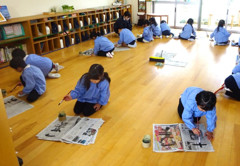 「書初めをしない?」誘ってみる。「小学生がやってる。」興味を示したので半紙を見せ、「この紙に、筆で書くんやけど、何文字くらいなら書けそう?」と問いかけると、いろいろ意見が出たが2文字に決まる。「じゃあ何を書く?」これも色々出たが、お正月らしい「こま」「たこ」干支の「うま」になった。早速新聞紙に練習してから半紙に清書した。みんな姿勢がいいし、のびのび書けている。字に関心を持って欲しい。