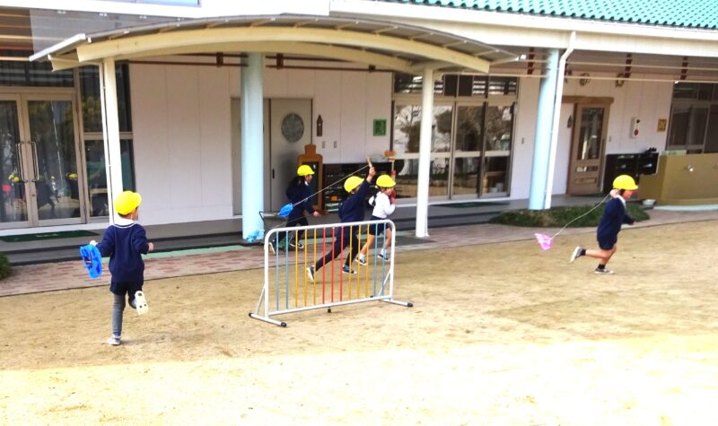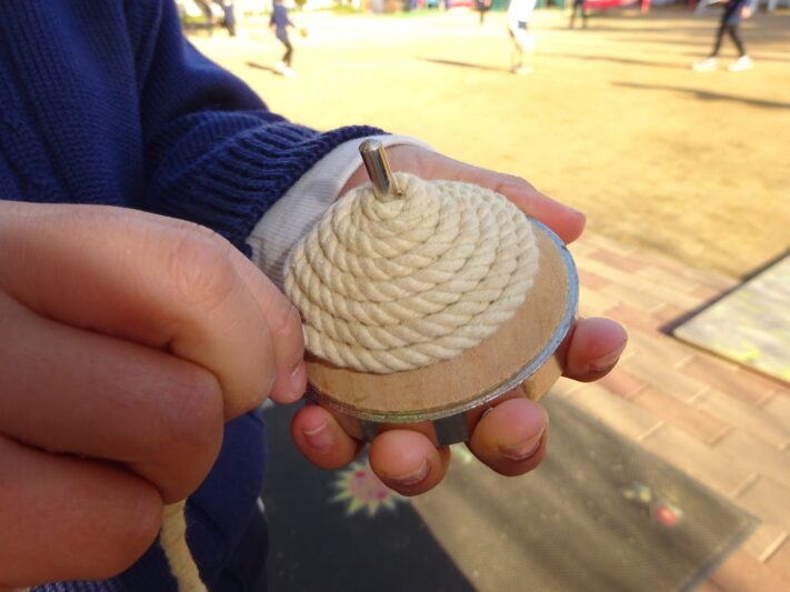 最初にひもの巻き方を伝えたが、こまのどこをどう持ったらいいか全くわからない。それでも、何度も挑戦しているうちに、こまの側面をもって、ひもは短く持って巻いていくと、巻きやすいことを学んでいく。 次は投げる。こまを真っすぐ投げて、ひもを素早く自分の方に引き寄せる。うまく回りません。「むずかしい!!」「できひん!でも楽しいんやけど・・・」口惜しさと葛藤しながら諦めずに頑張っている。昨日は、ひもが巻けなかった子が、今日は上手に巻けるようになったり、ひもごとこまを投げていた子が、ひもを指に挟んだまま引けるようになったり、少しずつできるようになっている。