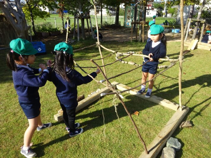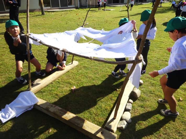 10月20日から1週間取り組んできたテント作りの遊び。少しずつ進歩するものの、屋根を付けるが上手くいかず失敗。”どうしたらうまくいくのか”話し合いを繰り返しながら遊ぶ。24日、縦の柱、横の柱が上手く建った。次は屋根作り。藁を乗せたが、風で吹き飛ばされてしまう。布に変更。しかし、まん中でたるんでしまい、思ったようなテントにならない。再び話し合い。「屋根を乗せる部分に柱がなく、まん中が空いていて支えるものがないのが原因ではないかと分かる。昨日(27日)は、「屋根を乗せるところにも枝を2本付けた。」とはいうものの、屋根の真ん中でたるんでいる。話し合いで「屋根はあれで完成だったの?」と聞くと、「真っすぐつけたかったけど崩れてきて、上手くできなかった。」と言う答え。「どうしてだったのかな?」と尋ねると、「真っすぐ付けたかったけど、崩れてきて上手くできなかった。」と言う答え。「どうしてだったのかな?」と尋ねると「屋根を乗せるところの枝が2本とも端っこにあったから。」・・・。屋根の真ん中を支えるために枝をつけるはずが、端に着けすぎて、結局真ん中は空いたままになっていたことが原因だった。「明日こそ完成させよう!」と意気込んで終わる。28日 屋根が来るところに枝を渡す。ひもでくくる前に、「その枝、もうちょっとこっちがええ。!」友達と確認しながら布を乗せ始める。反対側の友達に布を投げて覆いかぶせようとするが、まん中で止まってしまう。「真ん中届かへん。・・・そうや!中に入ったらええねん。」テントの中入って動かすと成功。「できた!できた!!」喜び勇んで中へ入る。柱の横に石が置いあるのは、「柱が倒れないように。」と、子どもたちが遊びの中で気づき考えたことです。難しいことも友達と一緒に考えながら諦めずに取り組む姿が見られ、とても素敵でした。学びの芽がどんどん膨らんでいます。